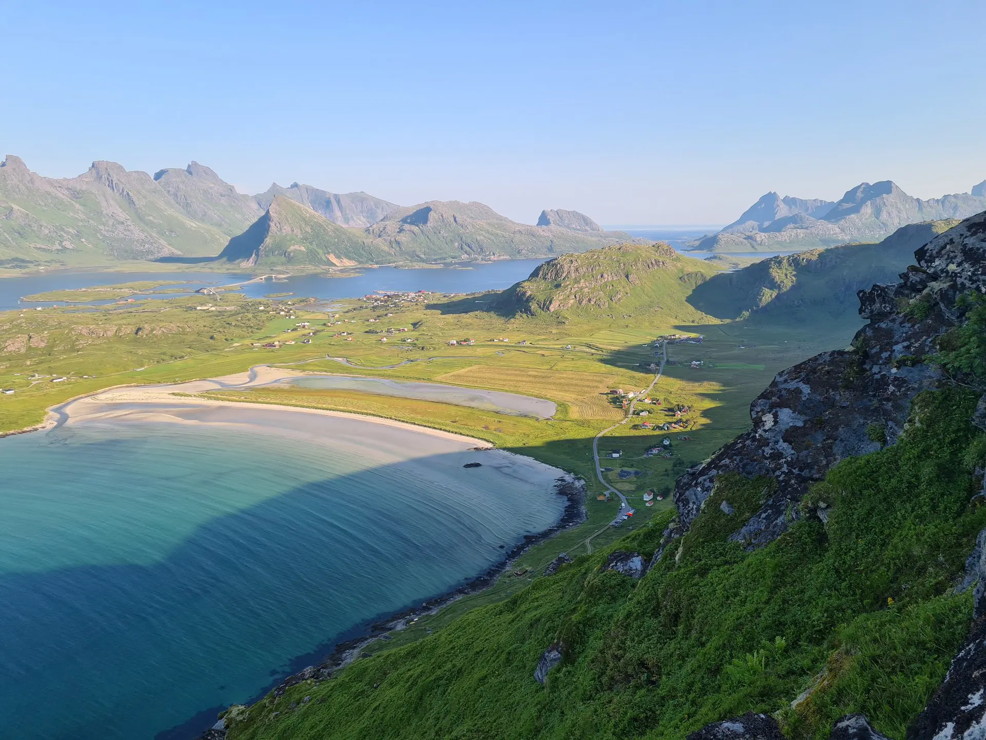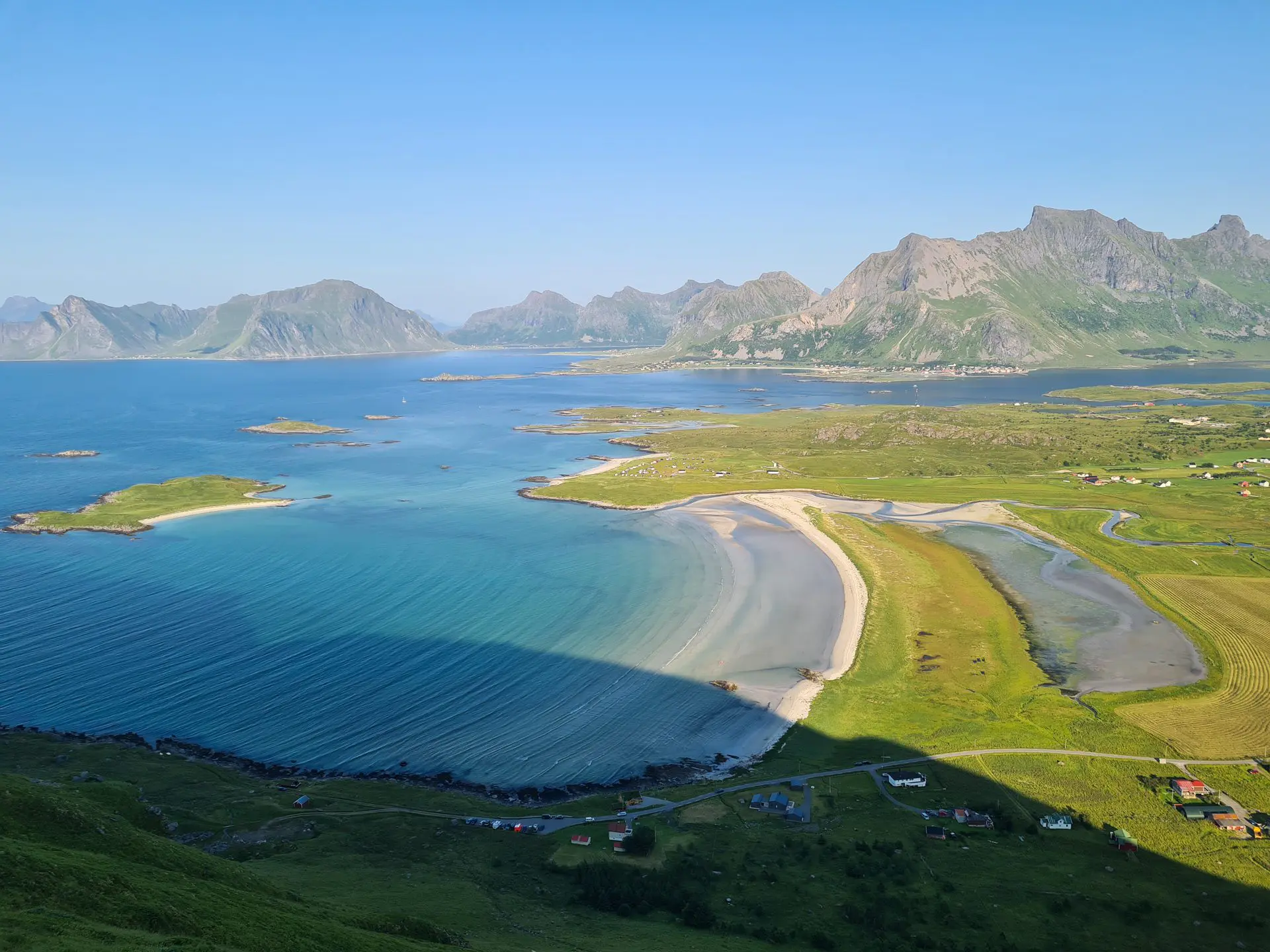 - Vue magnifique dès le début : le panorama se dévoile dès les premiers pas de l'ascension sur la plage de Sandbotnen, avec ses eaux turquoise et sa vaste étendue de sable blanc.