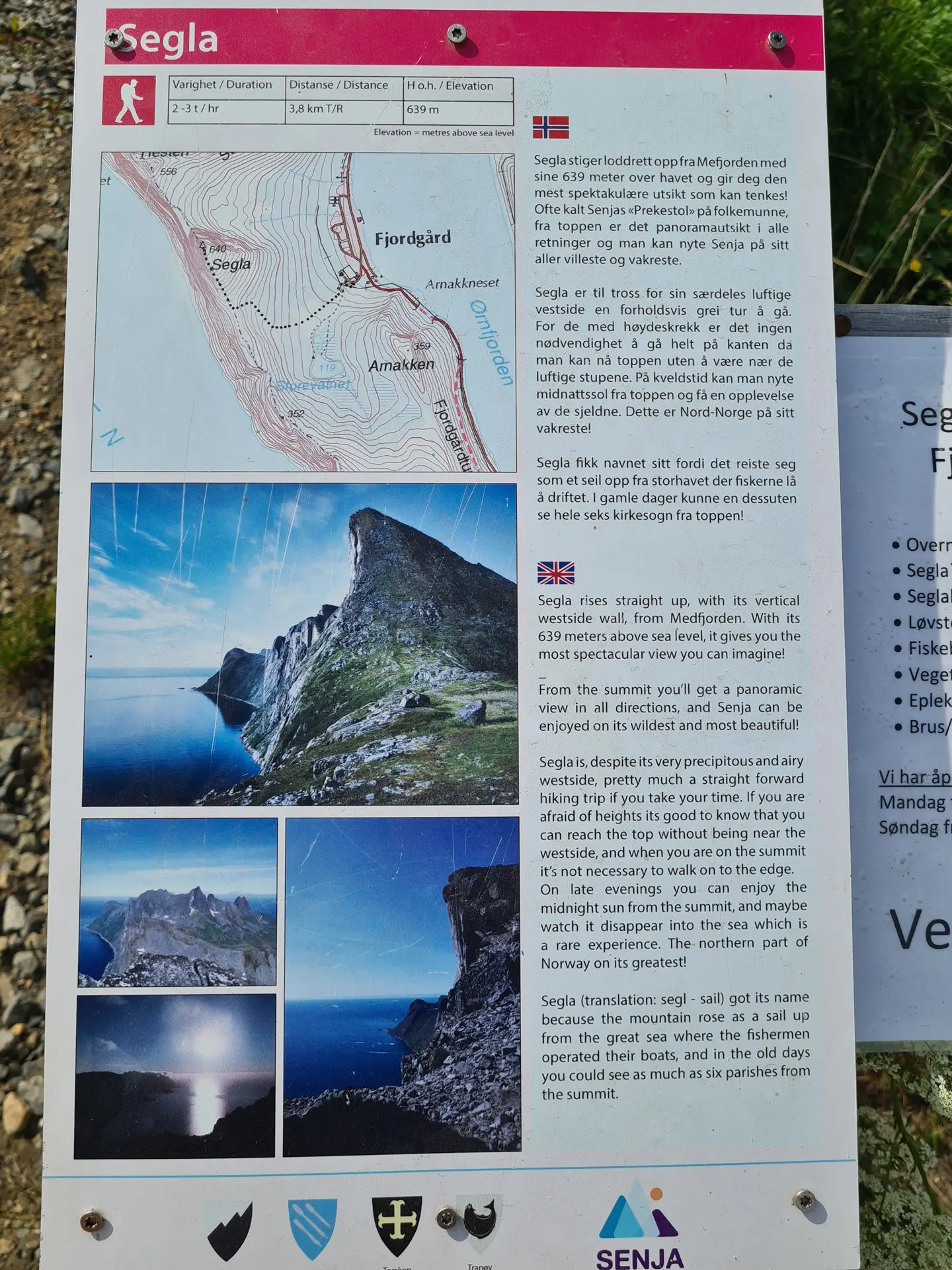 Segla, culminant à 639 mètres d'altitude, est le sommet iconique de l'île de Senja, en Norvège. On le surnomme parfois "la voile de Senja" pour sa forme si caractéristique. Bien que sa face ouest paraisse totalement inaccessible avec ses parois verticales plongeant dans la mer, l'ascension par sa face sud reste relativement simple malgré une pente particulièrement raide et sans répit.