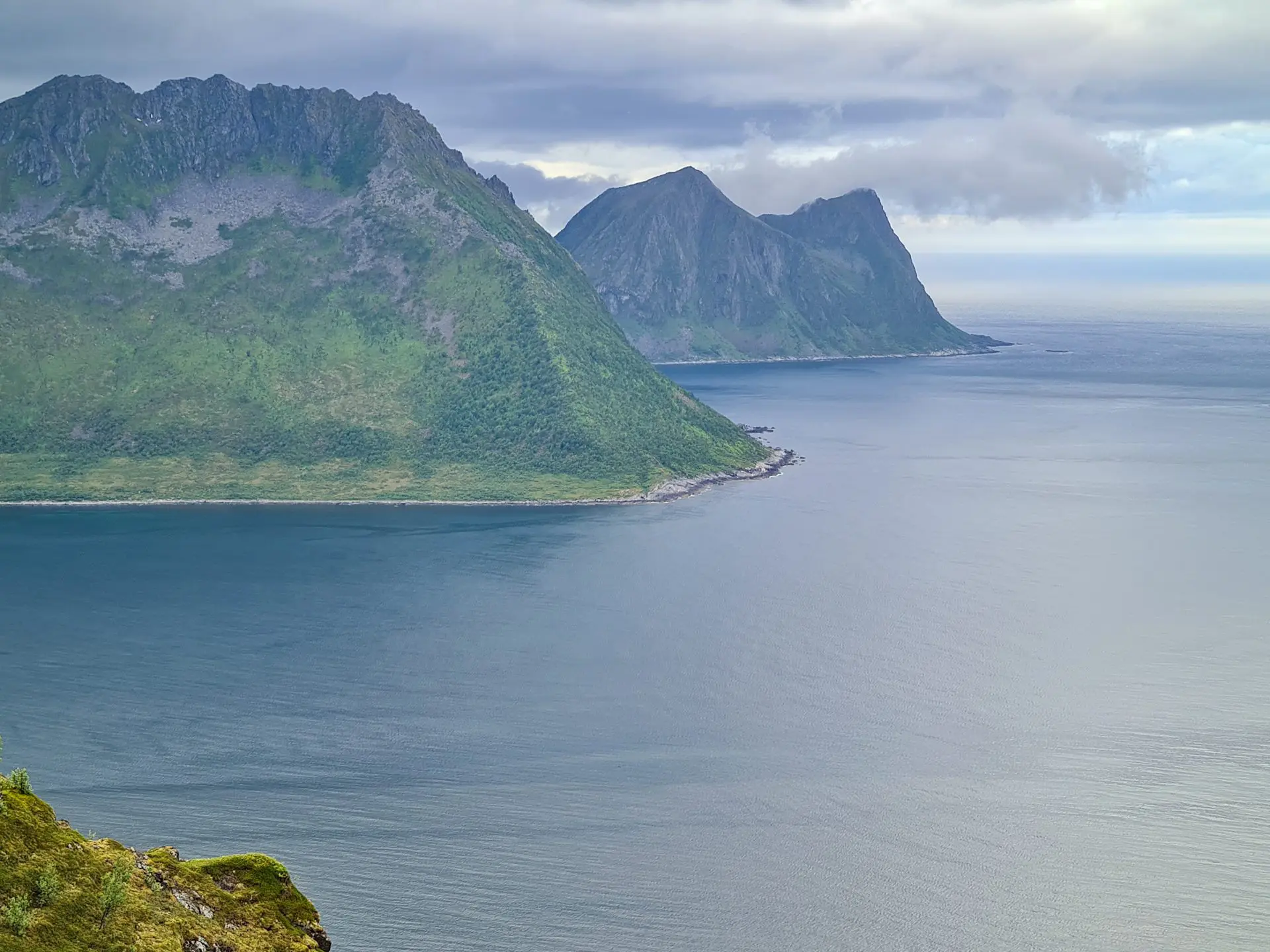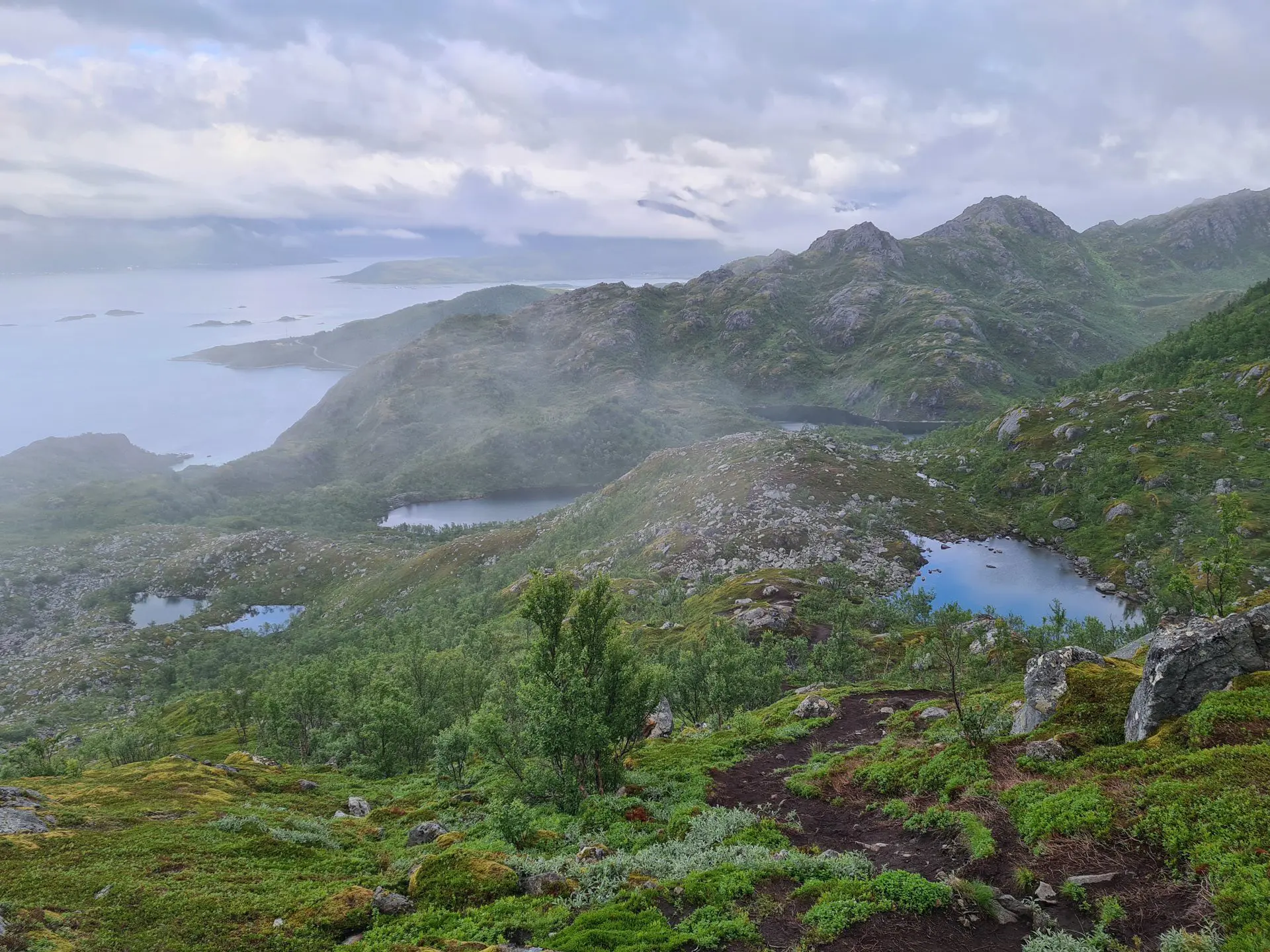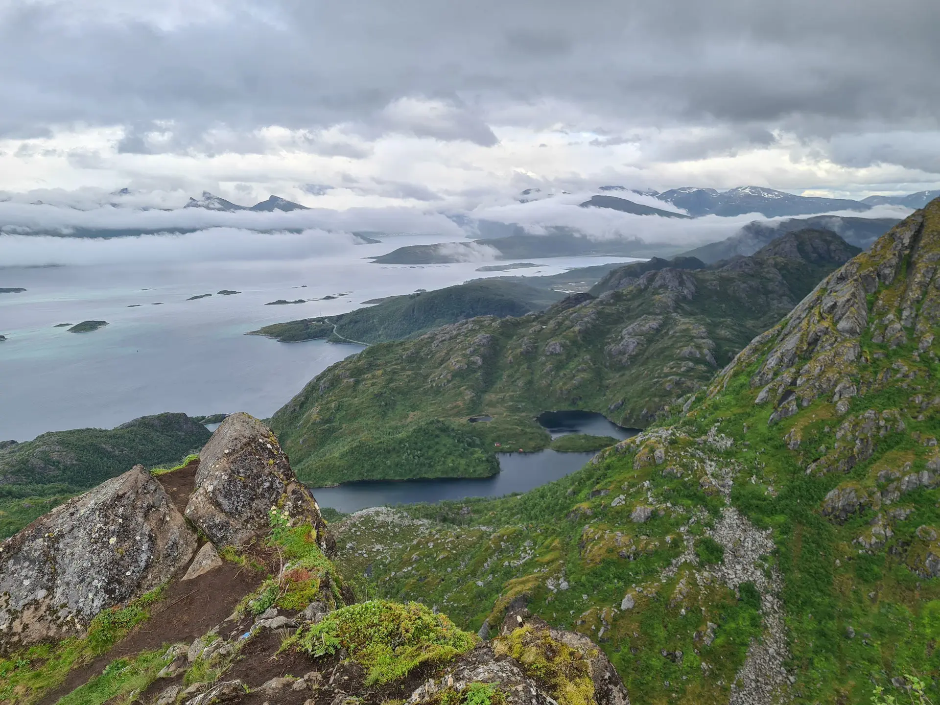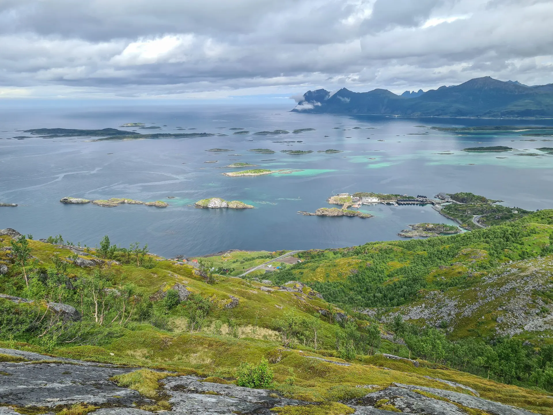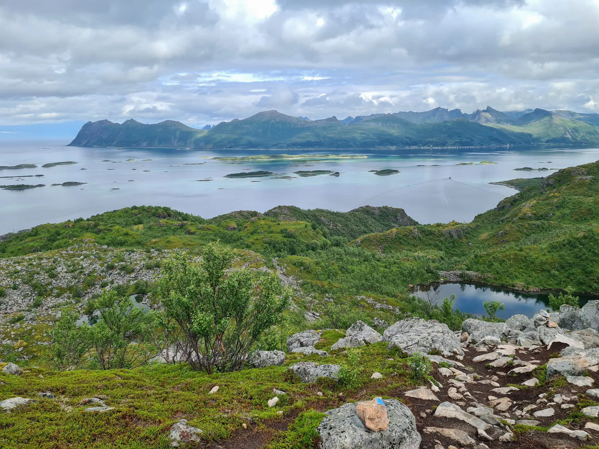 - Vue imprenable depuis le sommet sur les îlots de Bergsøyan, le nord de Senja, les nombreux lacs d'altitude, ainsi que le cirque et la crête de Helland.