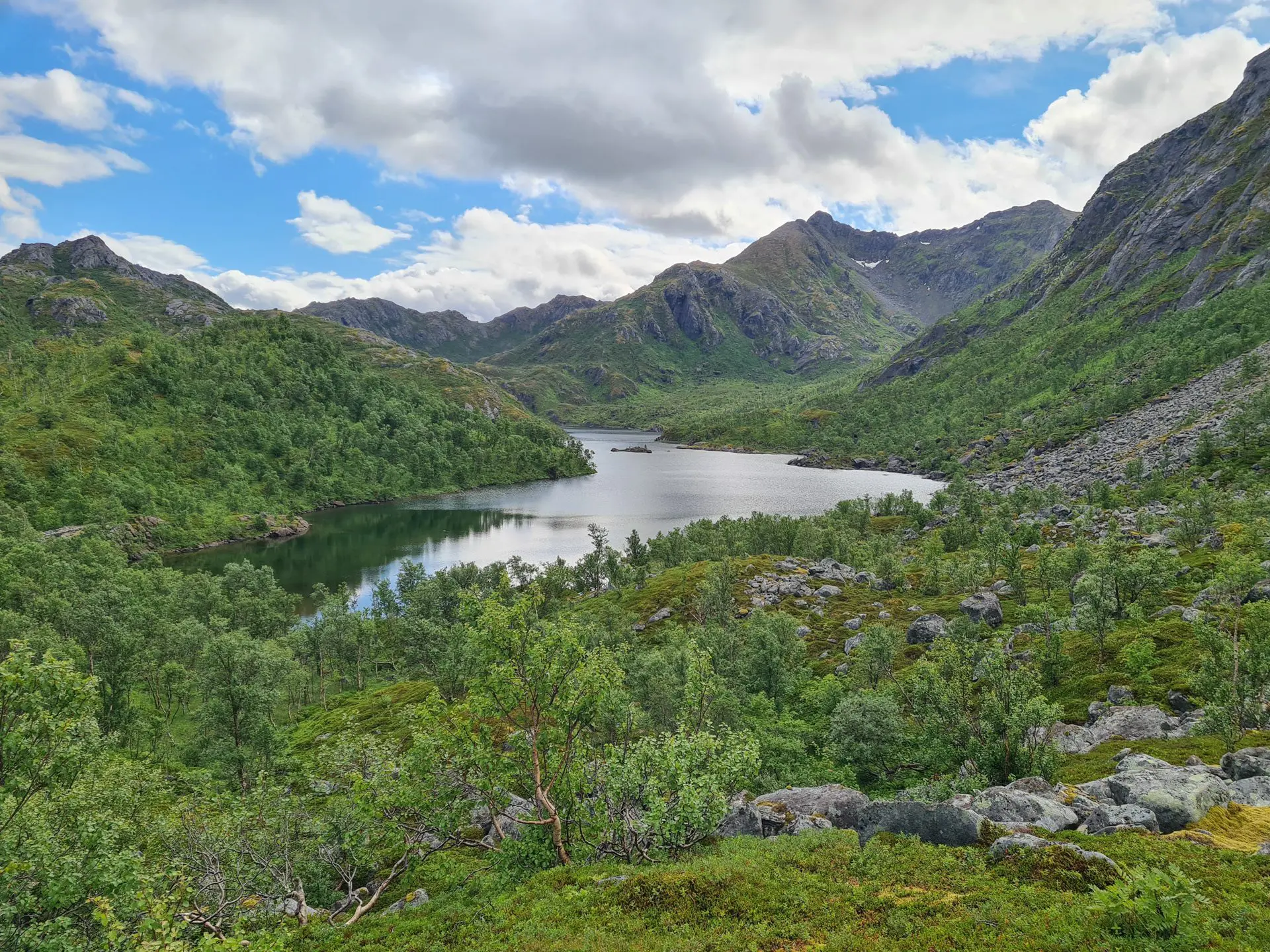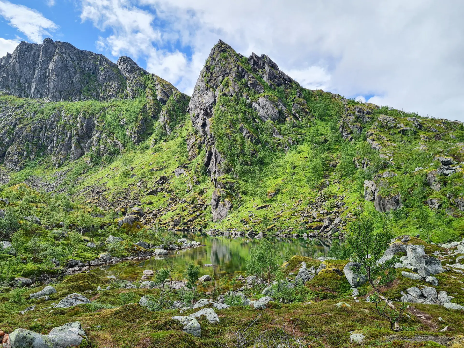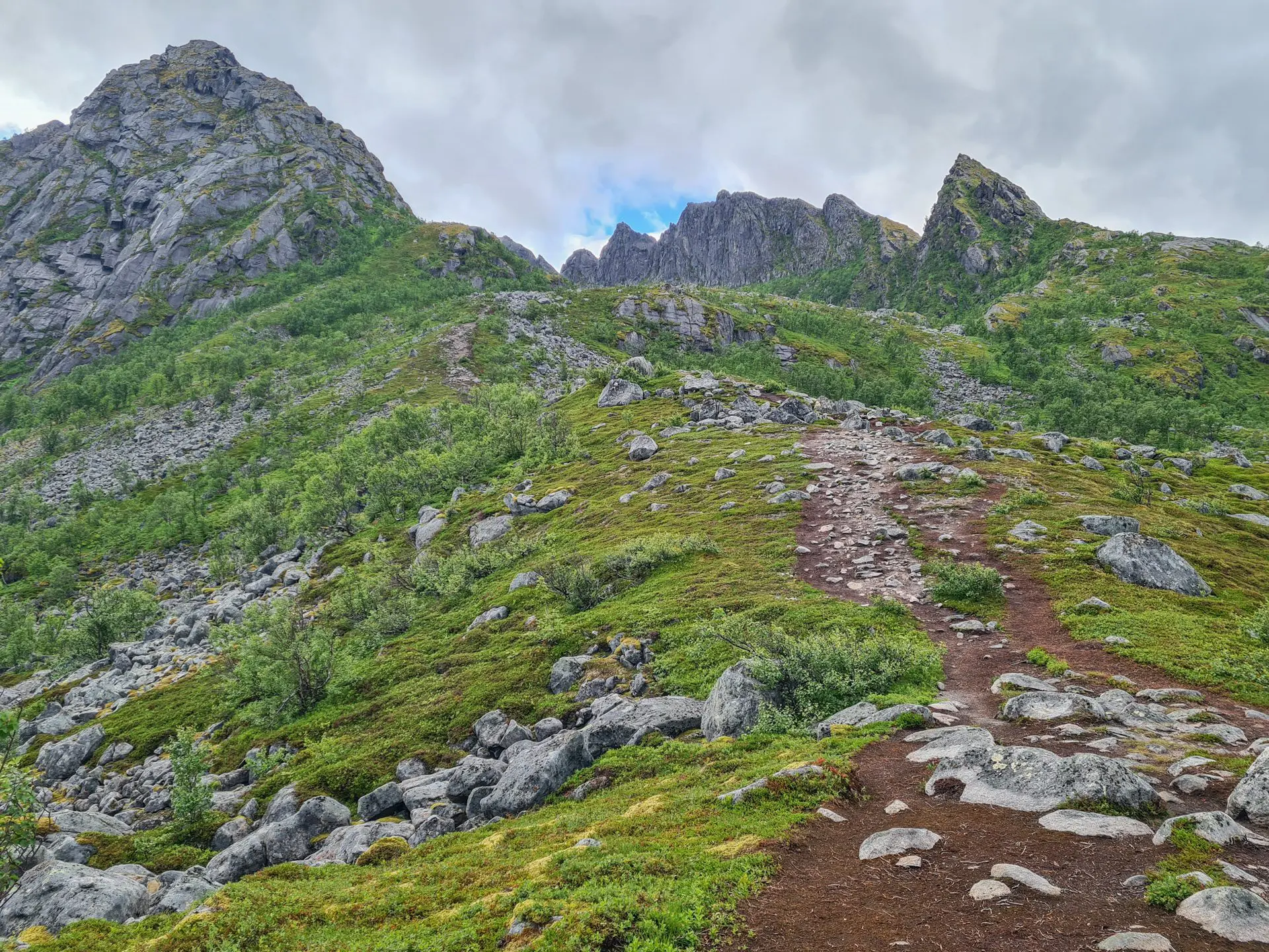 Le début du parcours traverse une végétation dense, souvent rendue boueuse par les précipitations fréquentes de la région, jusqu'au lac de Storvatnet. Par la suite, la pente devient nettement plus raide avec plusieurs passages rocheux techniques. L'un d'entre eux, particulièrement aérien, est équipé d'une chaîne – la plus grande prudence s'impose par temps humide, car le sol devient extrêmement glissant. Heureusement, le sentier demeure bien visible et correctement balisé sur l'ensemble du parcours, facilitant grandement la navigation.